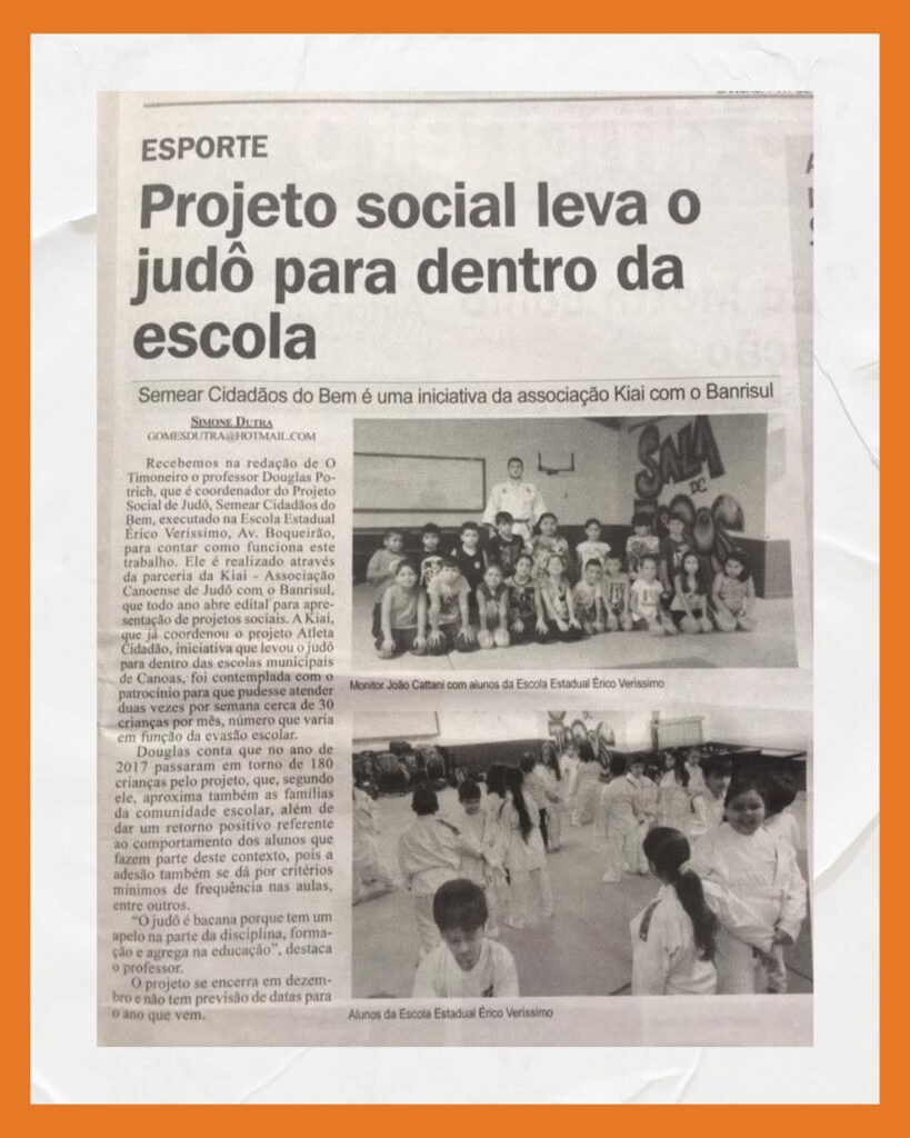 Outra lembrança que nos orgulha muito foi um projeto de 2017, em parceria com o Banrisul, que levou o judô para dentro das nossas escolas municipais: Projeto Semear Cidadãos do Bem. Este projeto, em que a Kiai esteve à frente, foi mais uma iniciativa pensando em como contribuir para a nossa sociedade, formando atletas e